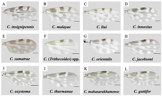 Figure 2. Wing morphology and pigmentation patterns of Culicoides species belonging to five subgenera and one species group trapped in this study. Culicoides subgenera or species group were represented as follows: Hoffmania (AE); Trithecoides (F); Avaritia (G,H); Remmia (I); Shermani group (J); and Meijerehelea (K,L). The scale bar represents 200 µM.