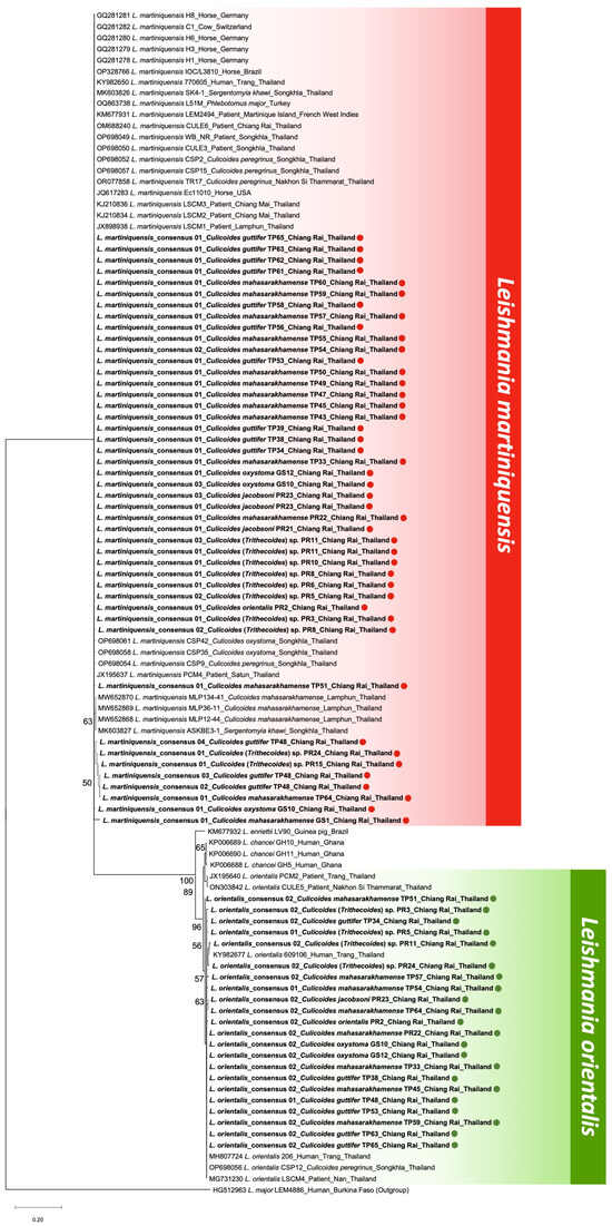 Figure 3. Species identification of Leishmania consensus sequences retrieved from Culicoides biting midges in this study, based on the ITS1 phylogeny using the maximum likelihood method with the K2+G model. The colored circles indicate our sequences, including L. martiniquensis (red) and L. orientalis (green) from six Culicoides species. L. major was used as the outgroup.
