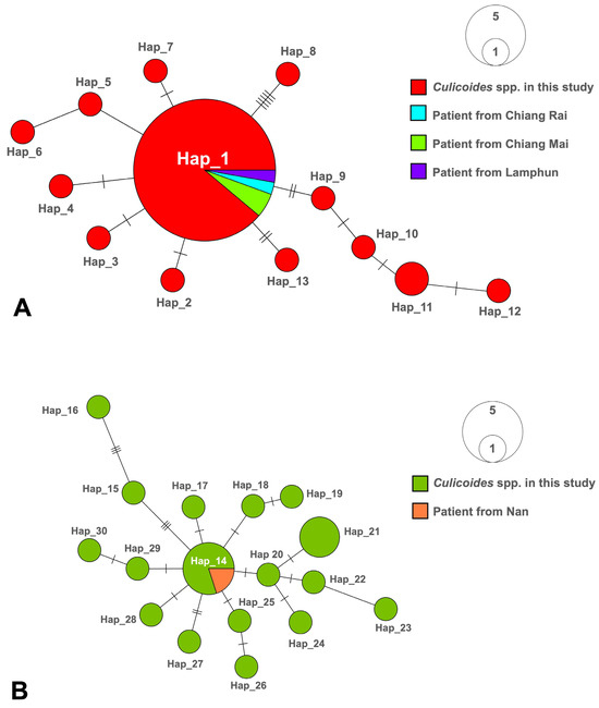 Figure 4. Haplotype diversity for the ITS1 sequences of L. martiniquensis (A) and L. orientalis (B) amplified from field-caught Culicoides biting midges in the present study and leishmaniasis patients previously reported from Northern Thailand. The circle size proportionally represents the frequency of each unique haplotype. Hatch marks across connecting lines represent the number of nucleotide substitutions between haplotypes.