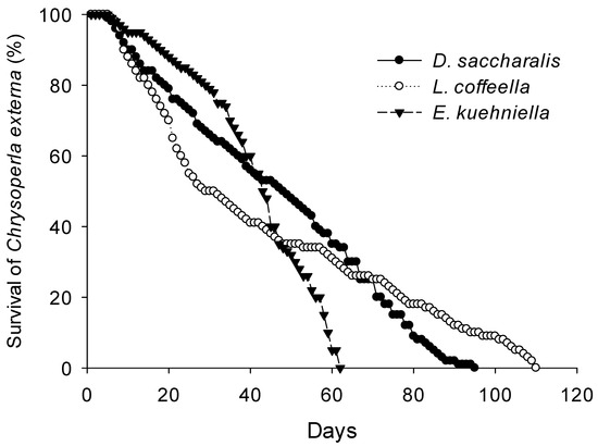 Percentage survival (egg until adult death) of Chrysoperla externa preying on Diatraea saccharalis eggs, Leucoptera coffeella pupae, and Ephestia kuehniella eggs (N = 80 green lacewings per prey item) (Cox regression, p < 0.05).
