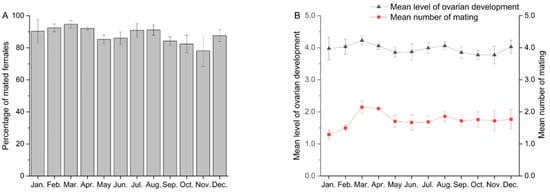 Ovarian development status of trapped Spodoptera litura females during each month from 2019 to 2023. (A) Percentage of mated females. (B) Mean levels of ovarian development and number of mating.