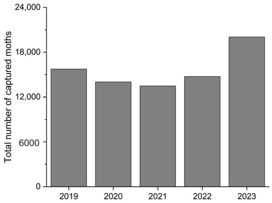 The previous studies showed that the searchlight trap could effectively capture the migrating population of S. litura [5,12]. From 2019 to 2023, searchlight traps were used to capture S. litura moths, which effectively attracted flying insects at altitudes of up to 500 m. The light was equipped with a 1000 W metal halide bulb (JLZ1000BT; Shanghai Yaming Lighting Co., Ltd., Shanghai, China), producing a vertical beam of light with a luminous flux of 105,000 lm, color temperature of 4000 K, and color rendering index of 65 [24]. A lamp with a parabolic reflector was installed at the center of a metal funnel with a diameter of 1 m and a net bag was hung at the bottom of the funnel to collect the trapped insects. The monitoring period was from 17 January 2019 to 31 December 2023. The searchlight was turned on at sunset every day and off at sunrise the next day, except during extreme weather, power outages, or lamp damage. After 1 d of freezing treatment, the trapped insects were classified and counted based on morphological characteristics and the S. litura moths were stored in the refrigerator at −20 °C for additional experiments.