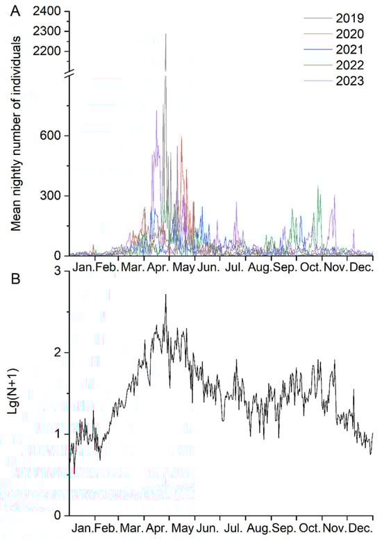 Based on the number of monthly catches, the entire year was divided into four periods by using the optimal segmentation of ordered samples: January–March, April–May, June–September, and October–December. This result not only has the lowest error function but also reasonably reflects the seasonal migratory population (Table 3). Therefore, in this study, we considered April and May as the peak spring migration period, October to December as the autumn migration period, and the remaining months as the transition period (Figure 3A). This result showed a consistent stable seasonal migration activity over the past 5 years (Figure 3B).