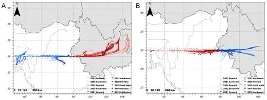 During the spring migration of 2023, all take-off points of the backward trajectories were located in low-altitude areas in north-central Myanmar and Yunnan; in other years, they were also found in Bangladesh and India. Overall, 54.3% of the backward points were in Myanmar and 39.7% were in South Asia (i.e., Bangladesh and the northeastern State of India), which were the primary sources of S. litura in Ruili. By contrast, the majority of forward landing points were distributed in the central and northeastern regions of Yunnan Province. Compared with the spring migration period, the direction of autumn movement was opposite to that of spring. Interactions between S. litura populations in Myanmar and China were more frequent in autumn. In 2019 and 2021, the forward landing points were located in South Asian countries. Specifically, 95.3% of forward points were from China and Myanmar and 4.7% were from south Asian countries. For the backward simulation, all points were located in China and Myanmar, accounting for 48.1% and 51.9%, respectively (Figure 4; Table 4). In these figures, some unnatural longitudinal dots along the outer boundary of the plotted area were caused by the trajectory-stopping calculation after exceeding the simulation boundary.