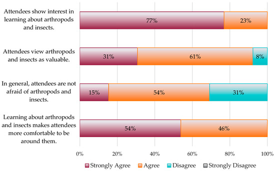 A series of Likert-scale statements were used to gather information about attendees’ attitudes toward arthropods and insects. The responses to these statements were primarily positive. Overall, 77% of respondents strongly agreed that attendees showed genuine interest in learning about arthropods and insects, 92% strongly agreed or agreed that attendees viewed arthropods and insects as valuable, 69% strongly agreed or agreed that attendees were generally not afraid of arthropods and insects, and 100% strongly agreed or agreed that attendees became more comfortable around arthropods and insects as they learned about these animals (Figure 1).