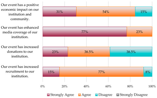 A series of Likert-scale statements were similarly used to gather information about the impacts these events had on respondents’ institutions and surrounding communities. The responses to these statements generally indicated positive benefits. Overall, 77% of respondents strongly agreed their event had enhanced media coverage for their institution, 85% strongly agreed or agreed that their event had a positive economic impact on their institution and surrounding community, 61.5% strongly agreed or agreed that their event increased donations to their institution, and 92% strongly agreed or agreed their event had increased recruitment to their institution (Figure 2).