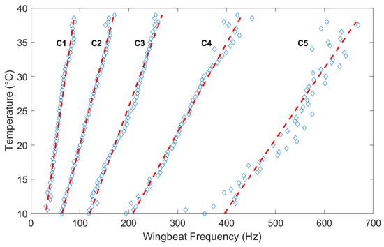 | Cluster Number | Average Wingbeat Frequency (Hz) | Slope (Hz/°C) |