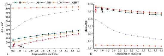 Spodoptera exempta modeling results as calculated using the ENMeval package, showing that the optimal parameter combination of FCs and RM in the MaxEnt models was LQHPT and 0.5. (a): Delta AICc value; the smaller the value the lower the model fit. (b): Mean AUC value; the optimized feature parameter has a higher value than the default feature parameter. The black arrows correspond to the default feature parameters, and the red arrows are the optimized feature parameters.