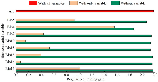 Correlation analysis of 19 bioclimatic variables was performed using ArcGIS 10.7 software due to the presence of multicollinearity between the bioclimatic variables (Figure S1). If the value of the correlation coefficient of two bioclimatic variables was greater than 0.8 (|r| > 0.8), the one with the greater contribution of bioclimatic variables was retained. Finally, eight bioclimatic variables were retained for MaxEnt model construction: the mean diurnal air temperature range (Bio2), the temperature seasonality (Bio4), the max temperature of warmest month (Bio5), the precipitation of wettest month (Bio13), precipitation of driest month (Bio14), the precipitation seasonality (Bio15), the precipitation of warmest quarter (Bio18), and the precipitation of coldest quarter (Bio19).