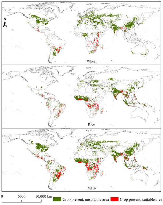 Overlapping areas of Spodoptera exempta and global wheat, rice, and maize planting areas under the current climatic conditions.
