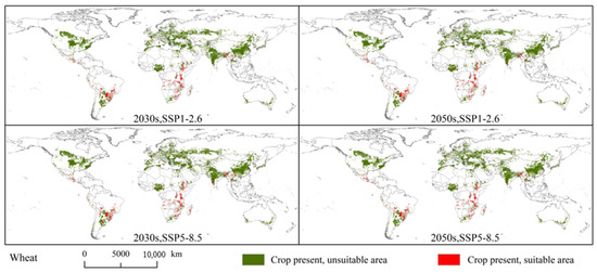 Overlapping areas of Spodoptera exempta and global wheat planting areas under the SSP1-2.6 and SSP5-8.5 in 2030s and 2050s.