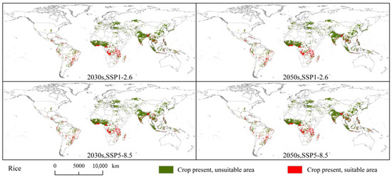 Under the current climatic conditions, the overlapping area between the global rice planting areas and potential suitable areas for S. exempta amounted to 312.3 × 104 km2 (approximately 20.89% of the global rice planting area). There exists no significant difference in the distribution of overlapping areas under the current and future climatic conditions. The overlap areas are mainly located in southern North America (southern and central Mexico, Honduras, Guatemala, and Cuba), eastern South America (eastern Brazil, Bolivia, Peru, and southern Venezuela), central and southern Africa (Tanzania, Mozambique, Madagascar, Angola, Democratic Republic of the Congo, Cameroon, southern Ghana), and southern Asia (southern India, Burma, Vietnam, Thailand, southwest China, and Indonesia) (Figure 7 and Figure 9). The overlap area was largest under SSP5-8.5 in the 2050s (296.36 × 104 km2), followed by SSP5-8.5 in the 2030s (295.83 × 104 km2), SSP1-2.6 in the 2050s (288.03 × 104 km2), and SSP1-2.6 in the 2030s (283.96 × 104 km2) (Figure S5). Under future climatic conditions, the overlap area will be reduced to some extent.