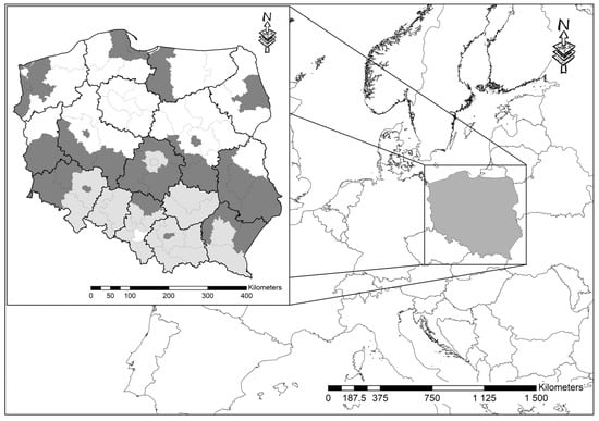 NUTS 3 territorial units in Poland, where work on the species composition of mosquitoes was carried out between the years 2000–2023 (dark grey), light grey areas—units where Ae. japonicus was found in 2023 [29,30].