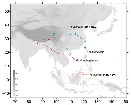 Distribution of species of the albomarginatus group of genus Rhagastis in this study. The blue dotted line indicates the range of R. dichroae stat. nov., the red dotted line indicates the range of R. albomarginatus, the orange dotted line indicates the range of R. everetti stat. nov., and the green circle indicates the range of R. binoculata.