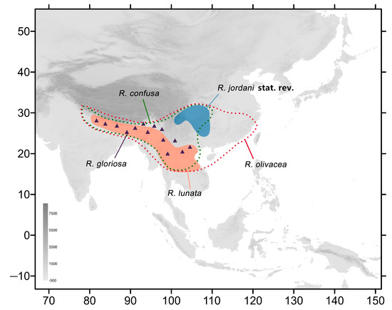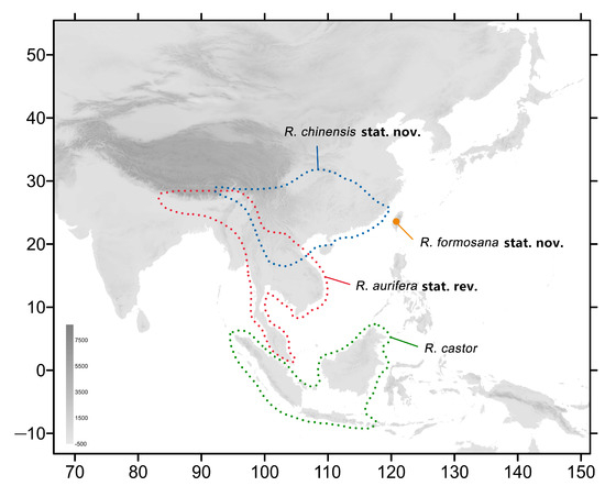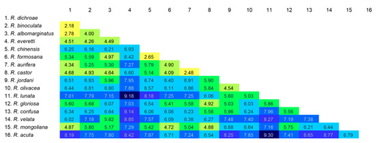 The first clade consists of R. dichroae stat. nov. and R. binoculata as sister species, while the second clade consists of R. everetii stat. nov. and R. albomarginatus. The four above-mentioned species belong to the albomarginatus group. The third clade comprises R. chinensis stat. nov. and R. formosana stat. nov. as sister species, while the fourth clade comprises R. aurifera stat. rev. and R. castor; these four species belong to the castor group. The fifth clade comprises R. jordani stat. rev., R. olivacea, and R. lunata, and is a sister species to R. gloriosa and R. confusa; these five species belong to the olivacea group. R. velata is closer to the olivacea group than to R. mongoliana and R. acuta (Figure 5). Given this molecular evidence, we propose the subspecies of R. albomarginatus and R. castor should be treated as good species.