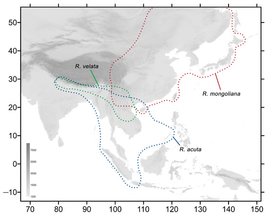 Distribution of the other species of genus Rhagastis in this study. The blue dotted line indicates the range of R. acuta, the red dotted line indicates the range of R. mongoliana, and the green dotted line indicates the range of R. velata.