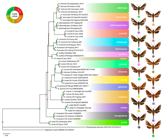 Maximum likelihood IQ-Tree phylogenetic tree of genus Rhagastis based on the DNA barcode sequences (cox1) and rooted with Phyllosphingia dissimilis and Meganoton analis as outgroups. Values at the nodes indicate bootstrap values.