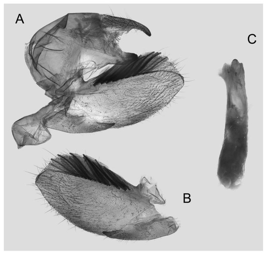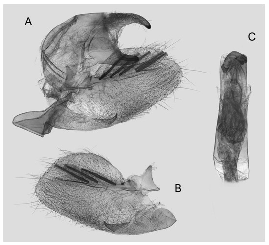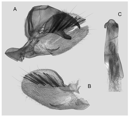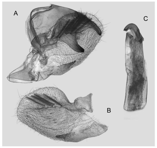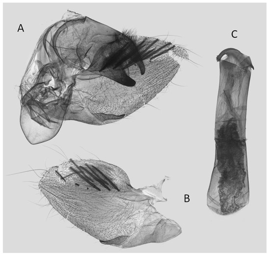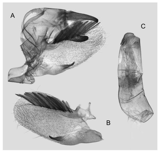 Male genitalia of Rhagastis everetti stat. nov., Mt. Halimun, Java, Indonesia. (A) Lateral view; (B) Left valve; (C) Phallus.