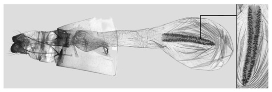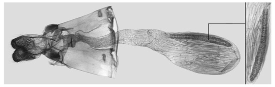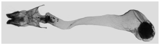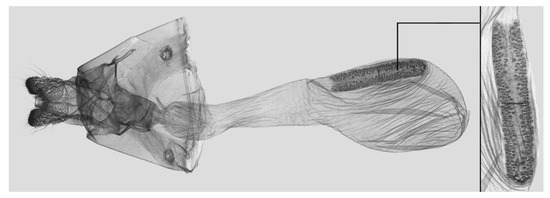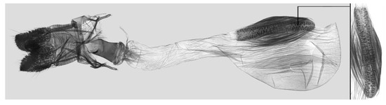 Female genitalia (Figure 9): Anal papillae apophyses rounded. Lamella antevaginalis sclerotized and narrow; lamella postvaginalis blunt; ostial lobe short and wide. Ductus bursae tubular and membranous. Corpus bursae round; signum a long tongue-shaped ovoid sclerotized patch, with tiny spines on both sides.