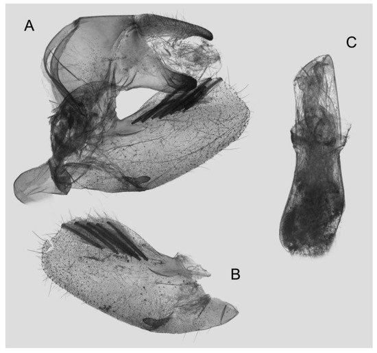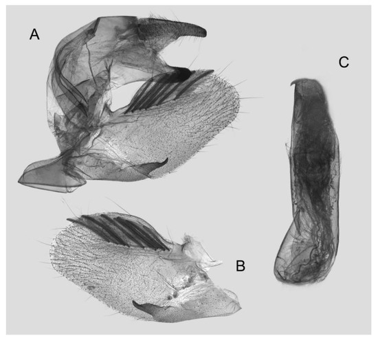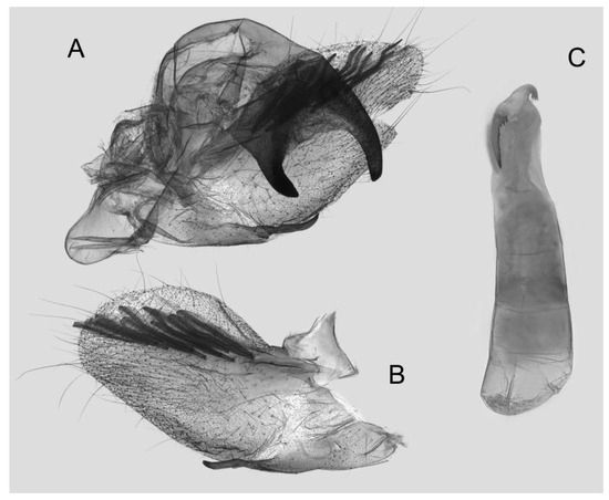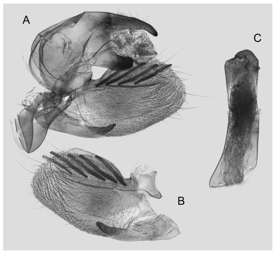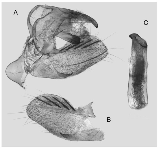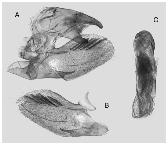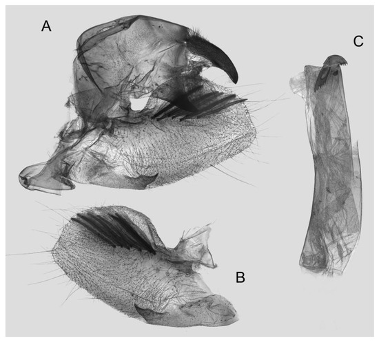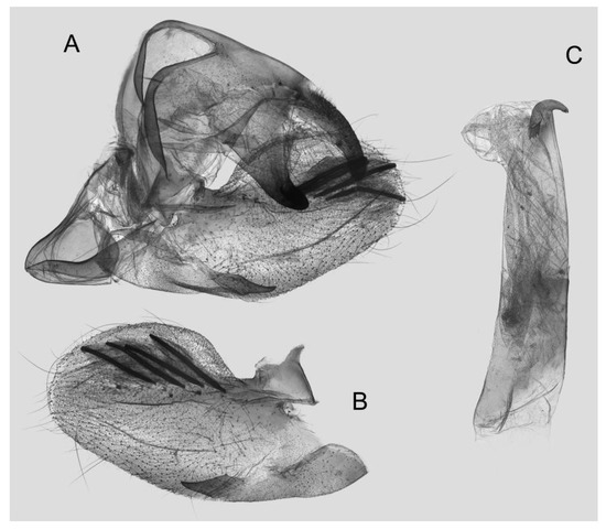 Male genitalia of Rhagastis albomarginatus, Jingdong, Yunnan, China. (A) Lateral view; (B) Left valve; (C) Phallus.