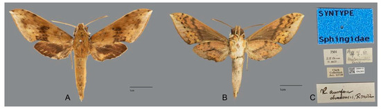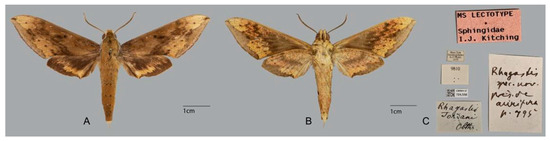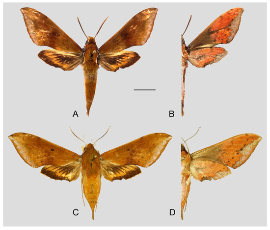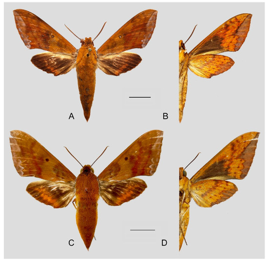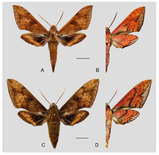Photos of Rhagastis binoculata. (A,B) Male; Taipei, Taiwan, China; (C,D) Female; Taotuan, Taiwan, China. Scale bar = 10 mm. © The Trustees of the Natural History Museum, London, UK (downloaded from Kitching, I. Sphingidae Taxonomic Inventory. http://sphingidae.myspecies.info/. Available online: accessed on 31 January 2024).