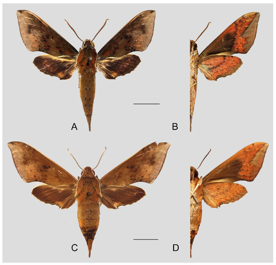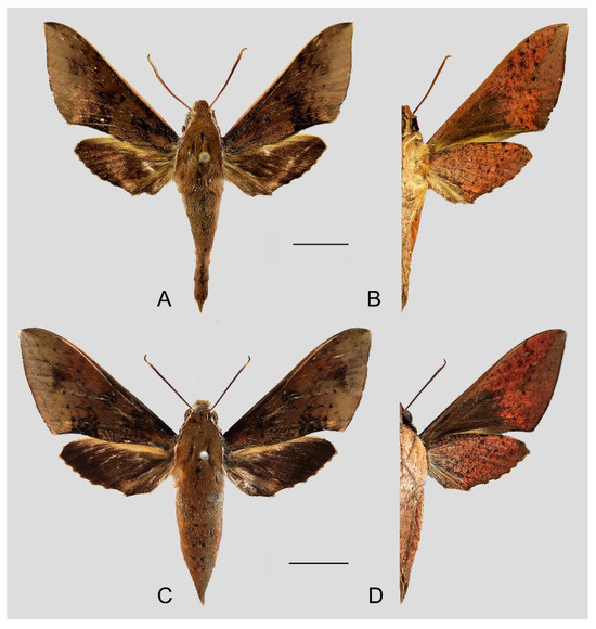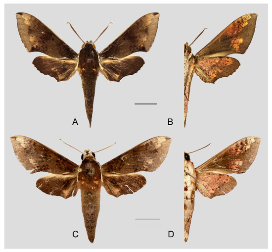 Photos of Rhagastis albomarginatus. (A,B) Male; Motuo, Xizang, China; (C,D) Female; Malipo, Yunnan, China. Scale bar = 10 mm.