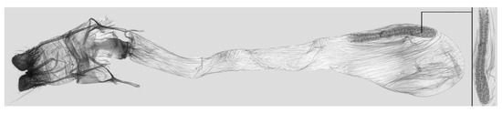 Specimens were spread for morphological comparison before molecular analysis based on habitus. The male and female forewing lengths were measured to 0.5 mm precision using a ruler. The whole abdomen was removed and placed into a 1.5 mL microcentrifuge tube and treated with 1 mL 10% sodium hydroxide (NaOH) solution for 1 h at 70 °C to digest the soft tissue. The treated abdomen was then neutralized with 2% acetic acid and dissected in a water-filled Petri dish under a stereomicroscope to remove residual tissues, scales, and hair. The genitalia were transferred to 80% glycerol for 12 h to render them transparent.