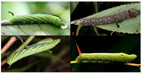 - Nozaki, A.; Miyata, A. Larvae of seven Japanese hawkmoths. Kita-Kyushu Konchu 1989, 36, 17–24. [Google Scholar]