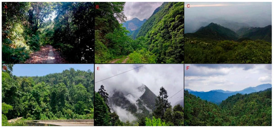 Habitats of genus Rhagastis from China. (A). Jiangfengling, Hainan, China; (B). Wuxi, Chongqing, China; (C). Tianmushan, Zhejiang, China; (D). Mengla, Xishuangbanna Yunnan, China; (E). Zayu, Xizang, China; (F). Yuexi, Anhui, China.