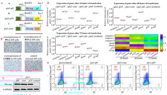 To investigate the impact of heterologous viral suppressor of RNA silencing (VSR) on insect cells or intracellular RNA interference (RNAi) mechanism, we initially assessed gene regulation and cell cycle in insect cells upon transfection with a plasmid overexpressing VSR. The four transient expression plasmids, pie1-p0, pie1-p19, pie1-core, and pie1 (control group), were transfected into insect Sf9 cells (Figure 1A,B). Subsequently, Western blot analysis was performed using the His-tag antibody to detect protein expression in the cell precipitates of each group after incubation at 28 °C for 24 h. The results demonstrated successful high-efficiency expression of P0, P19, and CORE proteins in Sf9 cells (Figure 1C; α-tubulin served as an internal reference). To investigate the impact of VSR expression on insect cells further, total RNA was extracted from the transfected Sf9 cells after 24–72 h of incubation for reverse transcription. The qPCR analysis revealed no significant changes in the expression levels of apoptosis-related genes (such as caspase and iap) compared to the control group, indicating that overexpression of VSR derived from single-stranded RNA viruses did not affect the insect Sf9 cells (Figure 1D). Additionally, flow cytometry was employed to measure the apoptosis rate of transfected Sf9 cells after 48 h. However, no significant differences were observed among the cell groups expressing VSR derived from plant or animal viruses with regard to gene expression regulation and cell cycle modulation (Figure 1E). Consequently, our findings demonstrate that the overexpression of RNA interference inhibitors in insect Sf9 cells does not exert any discernible impact on the apoptotic progression of these normal cells.