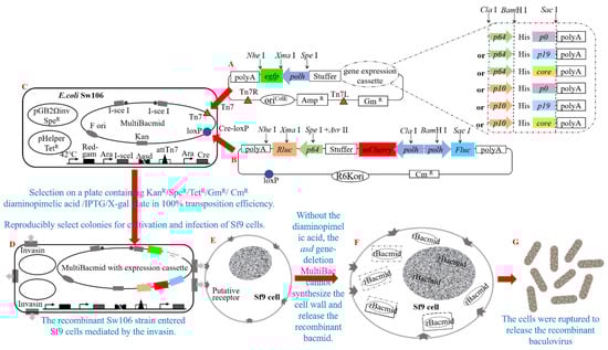 Escherichia coli (E. coli) DH10B, DH5α, and BW23474 were utilized to propagate MultiBac, R6k-γ, and general plasmids. The dual-purpose pie1 plasmid was specifically designed for cloning and achieving high-level protein expression through transient transfection of Spodoptera-derived insect cells. These plasmids contain an ampicillin resistance gene and an hr5 enhancer upstream of the pie1 promoter. The pFBDM and pUCDM plasmids, which are modified MultiBacs with antibiotics resistance genes inserted via transposition (mini-Tn7 and Cre-loxP), were constructed as described in our prior studies [33]. Recombinant MultiBacs were generated by utilizing multiple cloning sites (MCS) present in the plasmids (pFBDM and pUCDM) to introduce multiple foreign genes through specific transposition. E. coli Sw106 containing MultiBac, pHelper, and pGB2Ωinv was constructed as described in previous reports [33]. E. coli Sw106 can directly infect Sf9 cells and enter their cytoplasm to release recombinant MultiBac and generate recombinant baculovirus.