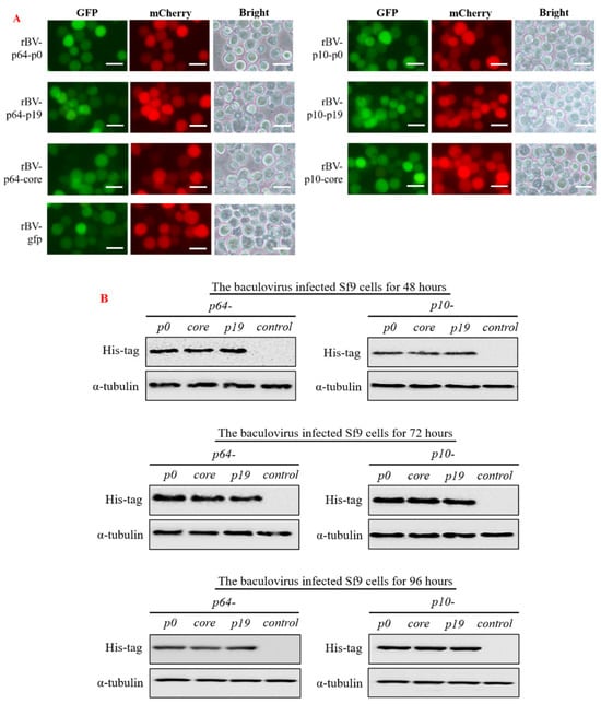 Following a 48 h incubation period with the recombinant baculovirus (MOI = 1), we effectively visualized high levels of red and green fluorescent proteins in Sf9 cells using fluorescence microscopy, confirming successful infection by the recombinant baculovirus (Figure 3A). The subsequent observation revealed that Sf9 cells in different treatment groups exhibited no discernible cytopathic effect or rupture compared to the control group (rBV-egfp). Additionally, we utilized antibodies against His-tag and α-tubulin protein (as a reference) for Western blot analysis to identify precipitates from Sf9 cells after incubation with the virus for 48, 72, and 96 h, respectively. The results demonstrated robust expression of VSR proteins in Sf9 cells (Figure 3B).