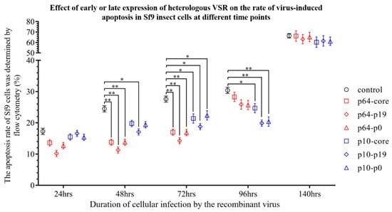 Impact of early or later expression of heterologous VSR on the rate of virus-induced apoptosis in Sf9 insect cells at distinct time intervals. (*: p < 0.05; **: p < 0.01; Compared with the control group).