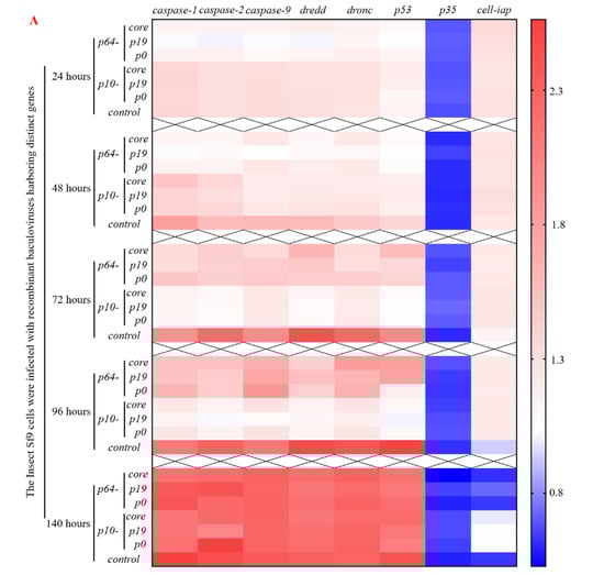 - Zheng, H.; Pan, Y.; Awais, M.M.; Tian, W.B.; Li, J.Y.; Sun, J.C. Impact of group II baculovirus IAPs on virus-induced apoptosis in insect cells. Genes 2022, 13, 750. [Google Scholar] [CrossRef] [PubMed]