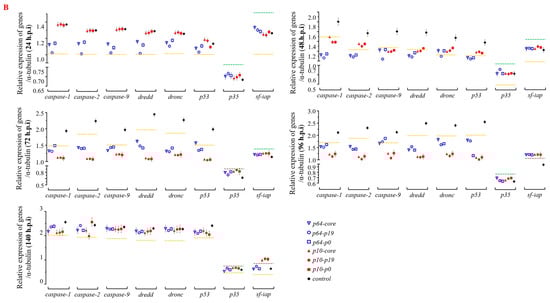 VSRs used in this study were derived from single-stranded RNA viruses infecting plants or animals and exhibited significant inhibitory effects on virus-induced apoptosis in insect cells. Molecular analysis of early apoptosis revealed that during the initial 24 h of viral infection in Sf9 cells, the expression of apoptosis-related genes was interfered with and inhibited. This suggests the presence of VSRs binding to double-stranded RNA molecules at an early stage of the RNAi process, preventing their cleavage. It also indicates that VSRs in insect cells share characteristics similar to those found in plant or animal cells, such as the P19 protein’s ability to bind with newly formed 21 nt and 22 nt RNA in plant cells, thereby hindering RISC assembly [26,44]. This regulatory mechanism is not limited to single-stranded RNA viruses but is also observed with FHV-B2 protein, NS1 protein of influenza A virus, Tomato aspermy virus (TAV)-2b protein, and other similar proteins [45,46,47]. Despite changes in gene regulation, there was no significant alteration observed within 24 h regarding the rate of apoptosis in Sf9 cells. This suggests that early viral infection does not initiate obvious apoptotic pathways immediately; there may be a certain lag between molecular regulation of apoptosis-related genes and the actual occurrence of apoptosis [48]. During the middle stage (48–96 h) of viral infection, both expression levels of apoptotic genes and cell death rates changed significantly. The effects varied depending on different time periods for p64 promoter and p10 promoter activities, mainly influenced by VSR expression levels during early and late stages. Combined with previous analysis on promoter efficiency, it was demonstrated that p64 activity primarily occurred within 12–24 h after viral infection, while p10 showed exceptionally high expression efficiency during 48–96 h [49]. The results demonstrated a significant increase in apoptosis at 140 h post-virus infection in all experimental groups, indicating the exclusive efficacy of VSRs against the RNAi mechanism while exerting no discernible impact on cells that had already undergone extensive apoptosis.