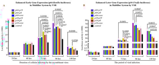 To investigate whether VSR enhances the expression efficiency of the recombinant baculovirus in insect cells, we introduced two luciferase reporter genes (Renilla- and Firefly-luciferase) into the viral genome using MultiBac in the recombinant baculovirus construction. The early promoter p64 and late promoter p10 of the virus were employed to drive luciferase expression separately. Analysis of luciferase detection results revealed that VSR could also enhance the efficiency of target gene expression to varying degrees in Sf9 cells 48 h after viral gene expression initiation. Specifically, within 72–96 h post-viral infection (MOI = 1), the expression of early protein (Renilla Luciferase, Figure 6A) was significantly higher than that observed in the control group (p < 0.05), while significant differences were observed for late protein (Firefly Luciferase, Figure 6B) within 96–140 h (p < 0.05). Notably, the P19 protein exhibited a more pronounced effect on enhancing exogenous gene expression than P0 and CORE. These findings provide initial evidence confirming that VSR derived from single-stranded RNA viruses also possesses the ability to improve exogenous protein expression efficiency in baculovirus expression systems, thereby augmenting the applicability of insect bioreactors.