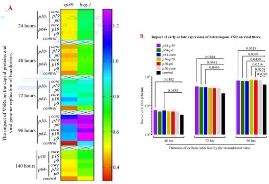 Impact of efficient heterologous VSR expression on viral nucleocapsid replication and progeny viral titers. (A) Heterologous VSR significantly upregulated the expression of capsid protein VP39 and enhanced the replication efficiency of the baculovirus genome. (B) Heterologous VSR markedly augmented the titer of baculovirus production in an insect cell bioreactor.