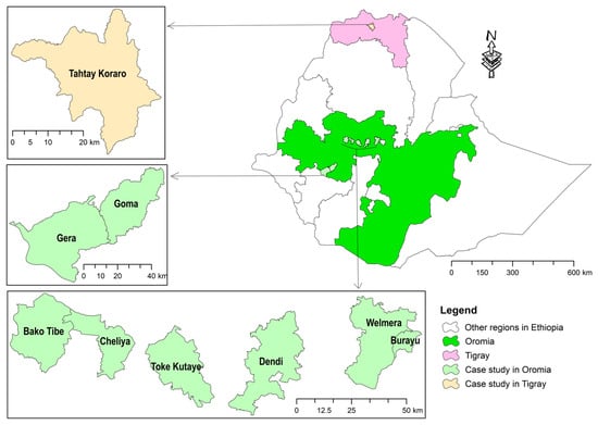 Location map of surveyed districts in Oromia and Tigray Regional States of Ethiopia in 2023.