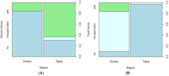 Table 2 shows a summary of descriptive results for the two studied regions and hypothesis tests comparing the regions. Beekeepers included in this study managed an average number of colonies of 27.00 and 9.03 in the Oromia and Tigray regions, respectively, in spring 2022. These increased to about 42.10 and 12.36 colonies on average before winter 2023 and again declined to 30.58 and 5.24 in spring 2023, respectively. Correlation analyses indicated that the number of colonies in spring 2022 and spring 2023 were strongly associated (Spearman correlation: r = 0.92, p < 0.0001). Mann–Whitney tests showed that there were significantly higher numbers of honey bee colonies in the Oromia region than in Tigray region during both 2022 and 2023 years (p < 0.001). A significantly higher proportion of beekeepers in Tigray monitored the status of varroa in their colonies (Figure 2). On the other hand, none of the beekeepers in Tigray applied any kind of colony treatment against varroa, whereas some beekeepers (16.1%) in Oromia applied the biotechnical method, trapping varroa mites mainly in drone brood combs and discarding them to reduce infestation without chemical treatment. While the percentage treating in Oromia is low, most of the beekeepers there (74.2%) responded that treating was not applicable.