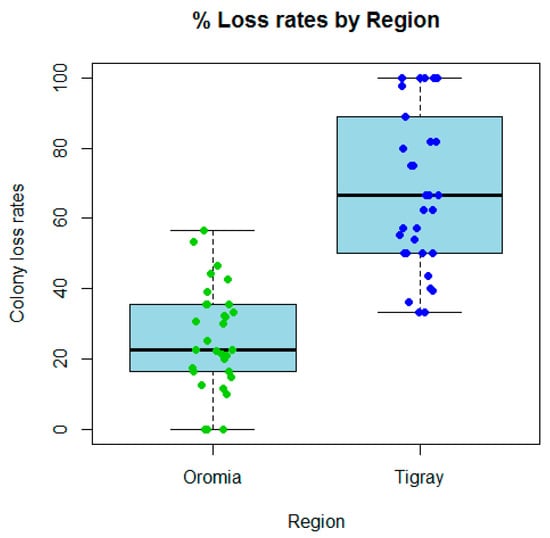To test the effect of various factors on the risk of colony loss, quasibinomial models were fitted. In the models for both regions combined, region, varroa treatment, presence of bees with deformed wings, use of foundationless combs, queen replacement, colony splitting, merging colonies, feed supplementation, and amount of sugar supplementation were individually highly significant predictors of the risk of colony loss. In a multivariable model, region and varroa treatment were still significant, but other variables were no longer significantly associated with colony loss. Therefore, the most important predictors of colony loss were region and varroa treatment (p < 0.0001). In addition, models were fitted for the regions separately where there was more than one category of a factor observed in the data. For Oromia, presence of V. velutina and sugar supplementation were the only significant variables for predicting colony loss. Of these, only presence of V. velutina significantly affected the loss rate when a multivariable model was considered, and is, therefore, the most notable predictor of colony loss in Oromia (p < 0.01). Table S1 shows details of the best predicting models. For Tigray, none of the individual factors were significant in the fitted models, but use of foundationless combs and merging colonies were closest to being significant predictors of colony loss. These results as a whole reflect differences between the regions. Consequently, colony loss rates were significantly different between the two regions (Figure 3) due to differences in natural disasters, environmental factors and beekeeping practices. These factors include varroa monitoring, varroa treatment, use of natural combs, dependence on externally supplied beeswax, colony merging, queen replacement, feed supplementation, colony splitting and Vespa velutina (Table 2). In particular, the presence of V. velutina was the most influential factor on colony losses in Oromia. Additionally, impact of the Tigray war is a major difference between the regions.