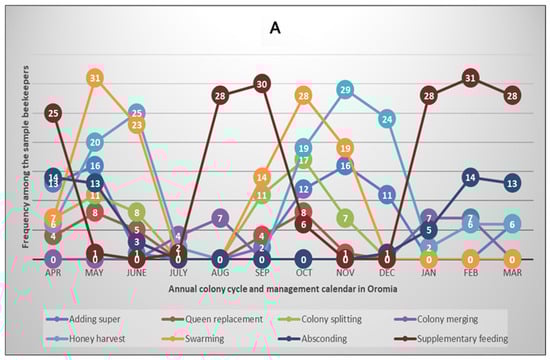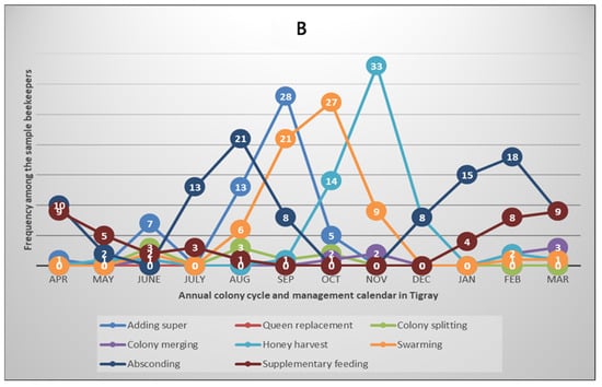 To obtain more insights into the annual honey bee colony development and beekeeping activity calendar, we collected data on the major events and practices that occurred and were performed by the beekeepers during the survey year. The variables include adding supers to hives, merging weak colonies, colony absconding, queen replacement, honey harvesting, feed supplementation, colony splitting and swarming. The results are summarised in Figure 4A,B for Oromia and Tigray regions, respectively.