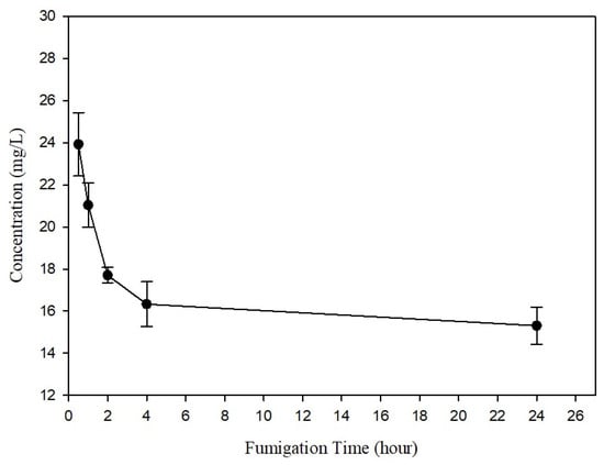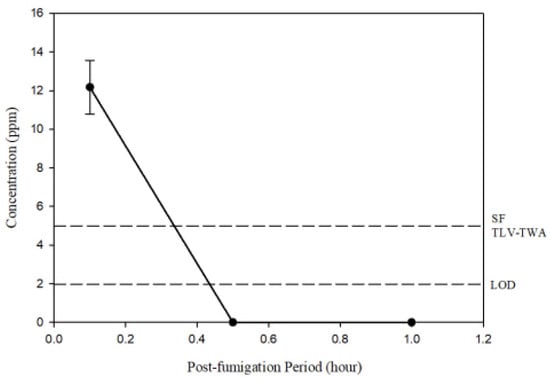 Based on the efficacy trials and sorption test with R. speratus, workers were fumigated at a concentration of 5 mg/L at 23 °C with a 90% loading ratio in a stainless chamber (0.5 m3) for 24 h. SF caused 100% termite mortality and no mortality occurred in the control. The concentrations 0.5 h and 24 h after the SF injections were 29.13 ± 7.9 mg/L and 15.31 ± 1.53 mg/L, respectively, which are greater than the injected dose of 5 mg/L (Figure 2). The LCt99 was 419.140.41 mg h/L, indicating values of more than 42.53 mg h/L of the LCt99 on the termites at 23 °C and 401.9 mg h/L at 5 °C in the laboratory trials. After the 24 h fumigation, the SF concentration inside the room, which included the fumigation chambers, decreased from 12.18 ± 2.4 ppm to below the limit of detection (1.98 ppm) within 0.5 h of ventilation (Figure 3). This reduction below the exposure limit (e.g., the threshold limit value for time-weighted average on the basis of an 8 h work day and a 40 h work week, TLV-TWA) of the SF threshold limit value (TLV) of 5 ppm confirmed the safe conditions for re-entry for work [28,29].