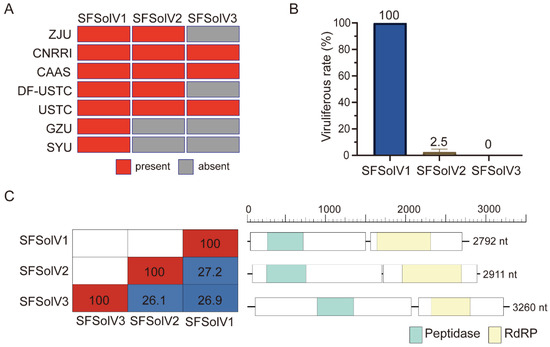 We employed RT-PCR to detect the presence of the three viruses in our lab populations. The results showed that the infection rate of SFSolV1 was 100% while SFSolV2 exhibited an infection rate of only 2.5%, and no infections were observed with SFSolV3 (Figure 1B). Consequently, we conducted RACE using the SMARTer RACE 5′/3′ Kit to obtain the full genome sequence of SFSolV1. The complete genome of SFSolV1 consisted of a polycistronic, positive-sense RNA molecule of 2792 nt, without a 3′-poly(A) tail (accession number: NMDCN000370F). It comprised two predicted open reading frames (ORFs) analyzed using NCBI ORFfinder. ORF1 (nt 39–1485) contained a peptidase domain, while ORF2 (nt 1457–2696) contained an RdRP (Figure 1C). Similar predictions were made for viral ORFs and protein functions in SFSolV2 (accession number: NMDCN000370G) and SFSolV3 (accession number: NMDCN000370H). Both SFSolV2 and SFSolV3 consisted of two ORFs, where ORF1 contained a peptidase domain and ORF2 contained an RdRP domain (Figure 1C). The RdRP nucleotide sequences of the three viruses revealed 26.1–27.2% identity (Figure 1C). These findings indicated that the genome organization of the three solemo-like viruses identified in this study was similar. However, no CP proteins were found, and their genome organizations differed significantly from those of known plant viruses in the Solemoviridae family [18]. Thus, further investigation is required to determine the evolutionary relationship of these three solemo-like viruses with plant viruses in the Solemoviridae family.