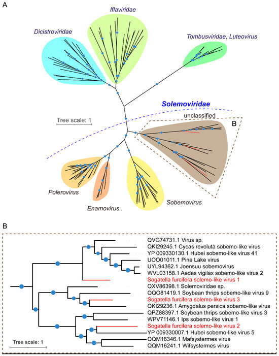 (A) Phylogenetic trees of the three solemo-like viruses identified in white-backed planthopper (WBPH). (B) The maximum-likelihood phylogenetic tree was created based on conserved viral RdRP domains. The viruses SFSolV1-3 are shown in red front. Nodes with bootstrap values >70% are marked with blue circles, and the larger circles indicate higher bootstrap values.