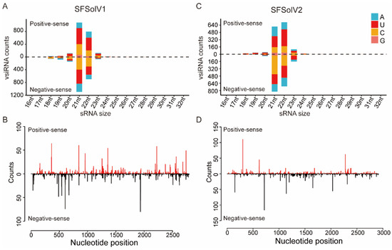 Profiles of Sogatella furcifera solemo-like virus derived sRNAs. The sized distribution of SFSolV1- (A) and SFSolV2- (C) derived sRNAs, and the distribution of vsiRNAs corresponding to the viral genome of SFSolV1 (B) and SFSolV2 (D) were analyzed.