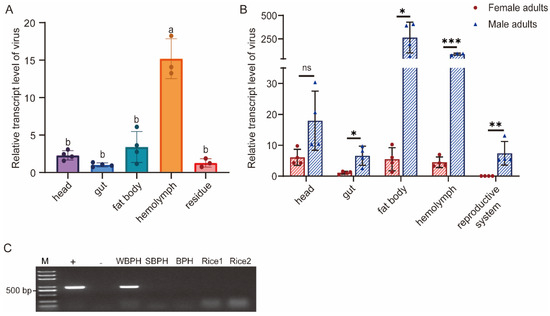 The distribution and abundance of SFSolV1 in different tissues of nymph and adult white-backed planthopper (WBPH). (A) Relative quantification of SFSolV1 in different tissues of nymph insects, including head, gut, fat body, hemolymph, and residue. Data are represented as means ± SEM of four biological replicates per sample. Different letters on the error bar indicate significant differences (p < 0.05, one-way ANOVA). (B) Relative quantification analysis and comparison of SFSolV1 between female and male adults in different tissues, including head, gut, fat body, hemolymph, and reproductive system. (C) Host range detection of SFSolV1. Virus detection in BPH and SBPH, which were fed together with SFSolV1-positive WBPH on rice seedlings. This electrophoretogram is representative as three repetitions. M, DNA marker; +, positive control; -, negative control; Rice 1, feeding rice seedlings; Rice 2, non-feeding rice seedlings. * p < 0.05; ** p < 0.01; *** p < 0.001; ns, not significant.
