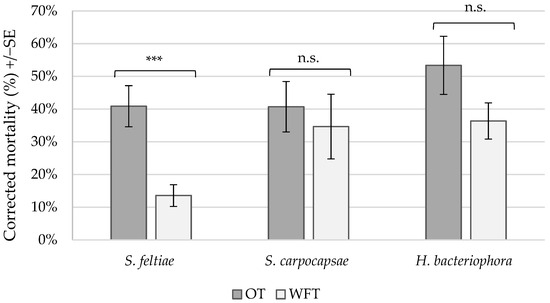 Mean corrected mortality (%) of pupating Thrips tabaci (OT) and Frankliniella occidentalis (WFT) when treated with entomopathogenic nematodes Steinernema feltiae (N = 20), S. carpocapsae (N = 15), or Heterorhabditis bacteriophora (N = 15) in laboratory assays. Replicates were conducted over 2 time blocks for each nematode species. *** indicates a significant difference between thrips species within nematode species > 0.001; ‘n.s.’ indicates no significant effect. Mortality was corrected using Abbott’s formula [60] using control mortality for each species within each experimental block.