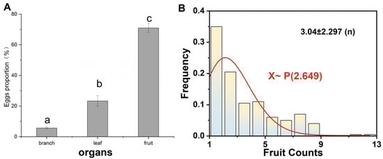 (A) Proportion of eggs on each organ of walnut. Different letters represent the presence of significant differences (ANOVA, LSD test). (B) Histogram of frequency distribution of fruit counts.
