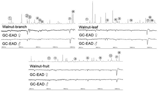 Healthy 20-year-old ‘Wen 185’ walnut trees were selected for the collection of volatiles from the different organs of the walnuts using headspace dynamic adsorption. For gas collection, one end of the odorless silica gel tube was connected to live walnut leaves, branches, and fruits, which were covered with polyethylene bags using an activated charcoal filter tube. The other end was connected to an adsorbent tube (made of stainless steel with an outer diameter of 6 mm and a length of 100 mm and filled with the adsorbent Tenax-TA) using an atmospheric sampling instrument (QC-1S, Labor Protection Science, Beijing, China). The flow rate was 0.8 L·min−1 and the sampling time was 6 h. The experiment was repeated 10 times. After collection, the samples were eluted with 1.5 mL of hexane and concentrated to 0.5 mL. The compounds in the eluate were identified using an Agilent 5977B GC/MSD GC-MS instrument (Agilent Technologies, Santa Clara, CA, USA). The column was an HP-5 measuring 30 m × 0.32 mm with a film thickness of 1.0 µm. The carrier gas flow rate was 1 mL min−1 with a split ratio of 5:1 and the transfer line temperature was 250 °C. The temperature increase was programmed from 50 °C (held for 5 min) at 8 °C·min−1 to 230 °C (held for 10 min). The mass spectrometry was performed at an ion source temperature of 280 °C, electron bombardment ionization (EI, 70 eV), full scan, scanning range of 30–400 m·z−1, and a resolution of 60,000. The data obtained from the assay were subjected to tracefinder deconvolution, peak extraction, and spectral library search (NIST, WILEY, and self-constructed libraries) for compositional identification. The compounds used as EAG tests and olfactory behavioral tests were verified by comparison with authentic standards, and other compounds by comparison with RI in the NIST database.