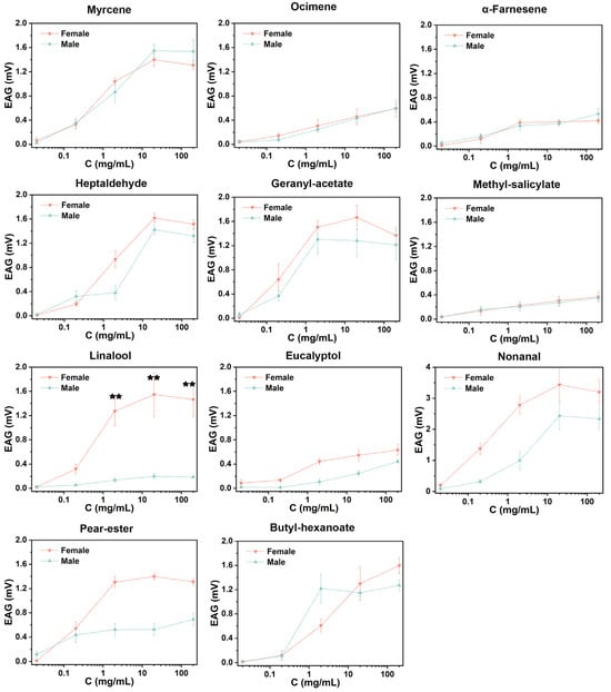 Electrophysiologic responses of antennae elicited by different doses of volatiles. ** indicates a significant difference between different sexes for the same concentration. (t-test, p < 0.01).